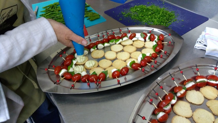 Onze laatste les van dit kookseizoen is achter de rug. Daar we dit maal voor de partners moesten/wilden koken en deze de lat hoog legden was er onder de koks wel wat stress te bemerken. Maar met Omer aan het roer was de stress snel verdwenen. De gasten werden om 20u in stijl ontvangen met een zelfgemaakte Hugo met daarbij enkele hapjes. Vooral het toastje met crème van tuinbonen met verse munt was vingerlikkend lekker! Daarna volgde het voorgerecht 'Italiaans gebraad van de chef met een slaatje en baragalega brood'. Verder volgde dan in buffet “gevulde pastaschelpen met vis in een romige witte wijn-saus” en een 'Orchetti met groenten en (zelfgemaakte!) venkelworst'. Wie denkt aan een gewone worst slaat de bal helemaal mis. Zelfs wie geen voorstander is van worst, was vol lof over de verrassende smaak! Als dessert was er een” panna cotta” en een 'trifle' met bosbessen. Tuurlijk hadden we weer teveel gemaakt … sommigen bleven eten :-).